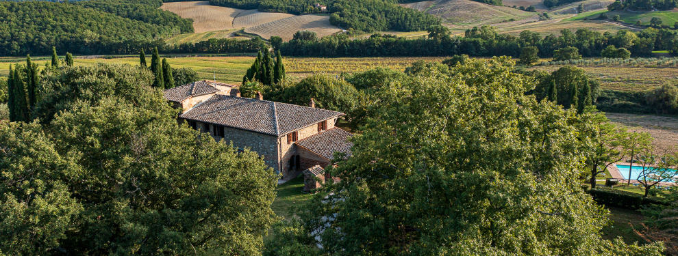 Casale di tipico sapore toscano completamente in pietra, con una splendida vista panoramica a 360° sulla campagna Toscana, accuratamente ristrutturato con grandi camini, pavimenti in cotto e soffitti con travi a vista.